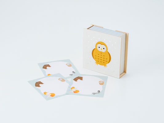 かわいくユニークなイラスト入り 紙製ケースのメモパッド 牛乳パック・紙バック再生紙「ミルクラフト」を使用した紙製ケースに、オリジナルデザインのメモ紙がセットされた、メモパッド製品。 3つのデザインシリーズ 「日本ニッポン」シリーズは「富士山」「忍者」「まねき猫」「桃太郎」の4ラインナップ。ユニークかつ親しみやすいイラストデザインのシリーズです。 「北海道の動物」シリーズは「キタキツネ」「エゾリス」「エゾフクロウ」「エゾヒグマ」の4ラインナップ。北海道に生息する動物たちを可愛らしく、品よくデザインしてみました。 「アイヌデザイン」シリーズは「アイウシ」「ルウンペ」「木彫り」の3ラインナップ。アイヌ工芸師とグラフィックデザイナーがコラボしてできたオリジナルデザインです。「アイウシ」はアイヌ文様のひとつで棘がついている文様のことです。「ルウンペ」は帯状の布を張り合わせ刺繍を施した衣装のこと。箔押し加工を用いて文様の特徴を表現しました。